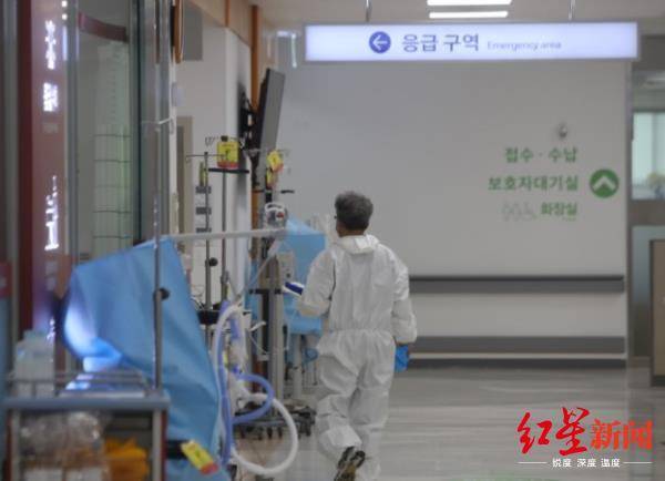 ↑大邱市南区岭南大学医院急诊室,一名身穿防护服的医护人员正走向病房(图据:韩联社)