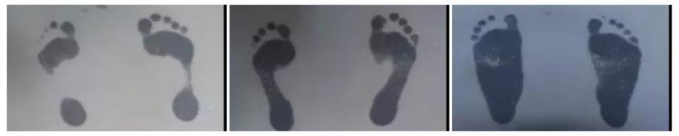 测试者赤脚蘸水,在干燥的纸面上或者水泥地面上留下足的印记。前脚掌与后脚掌水的印记断开,可以判断为高足弓(下左图);